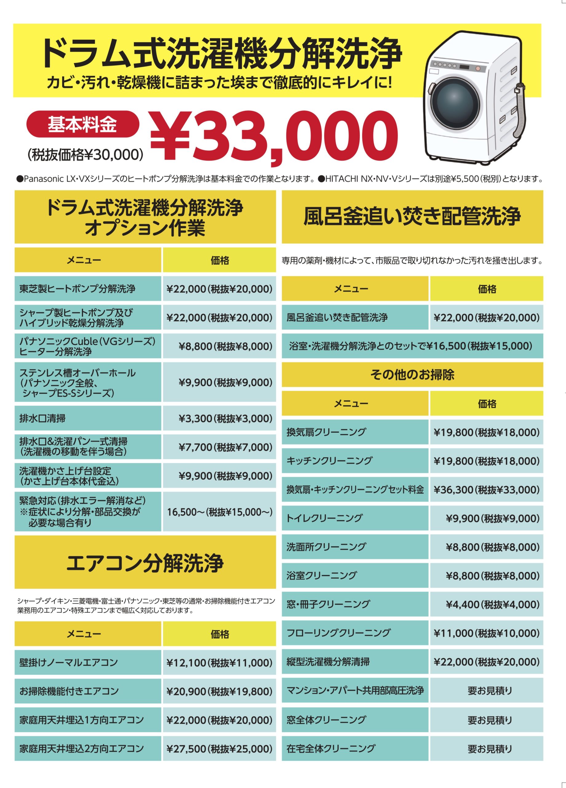 各種清掃メニューの料金表を公開しました