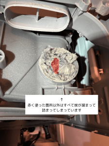 このような状態ですと、通常時は衣服からとれた埃は乾燥フィルターまで届かず、途中の通り道で詰まってしまうことになります。