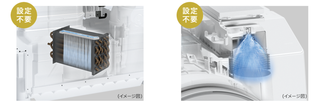 現在販売されている国内のドラム式洗濯機の多くには、運転前や運転中などにヒートポンプや乾燥経路に詰まった埃に水をかけて自動で清掃してくれる機能があります。